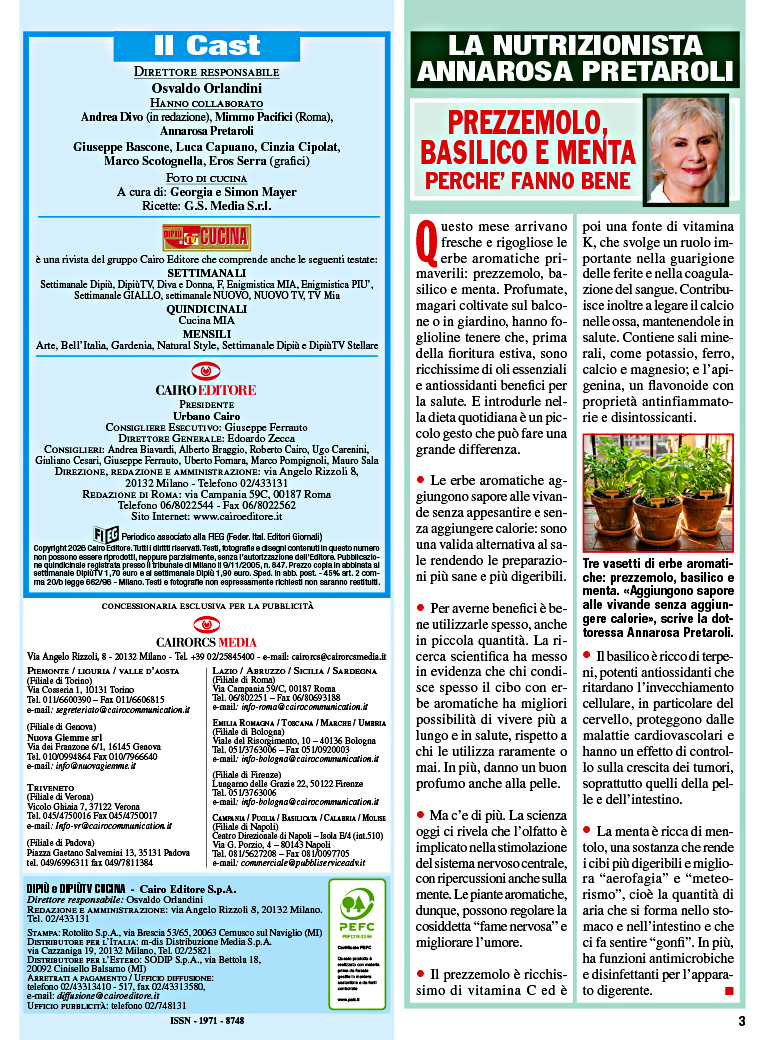 Ma trovi anche i piatti leggeri e vegetariani, i menù delle feste e le interviste ai personaggi famosi con i loro consigli in cucina.