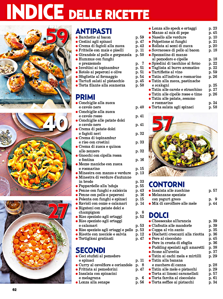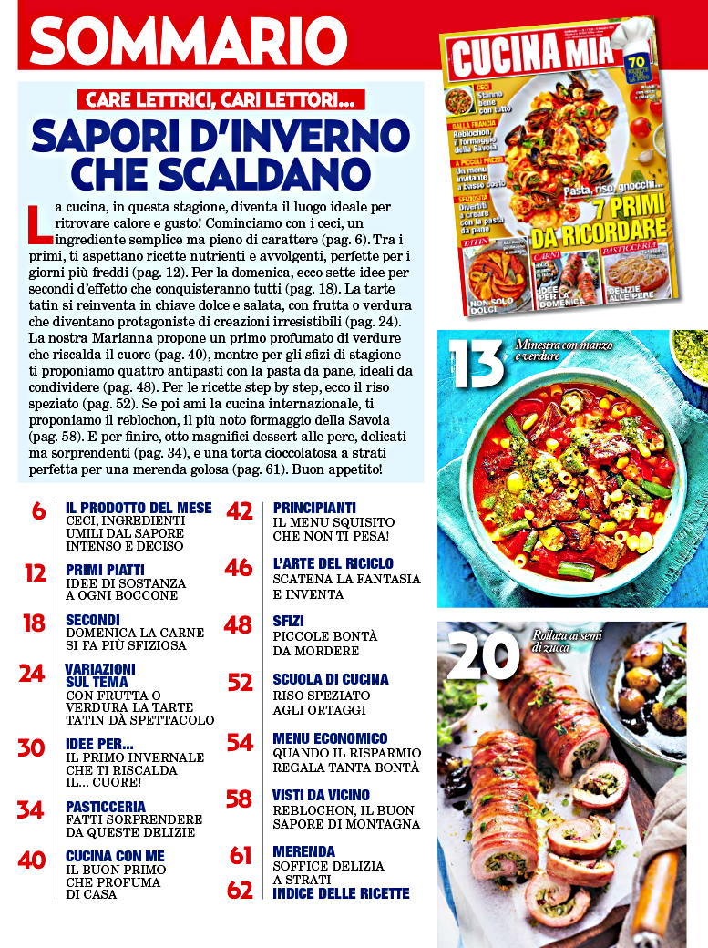 Una preziosa rivista da leggere e conservare con più di 70 proposte in ogni numero: dai piatti di stagione, ai menù più ricercati, a tanti gustosi suggerimenti su come evitare gli sprechi. In più, approfondimenti sulla cucina italiana ed esotica, e il meglio della gastronomia regionale e internazionale.